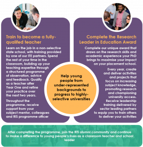 The RIS Programme offers a tailored route into teaching exclusively for PhD graduates. It is specifically designed to utilise your academic expertise to the benefit of pupils, schools and universities. We place participants in non-selective state secondary schools across England, in partnership with number of teacher training providers.